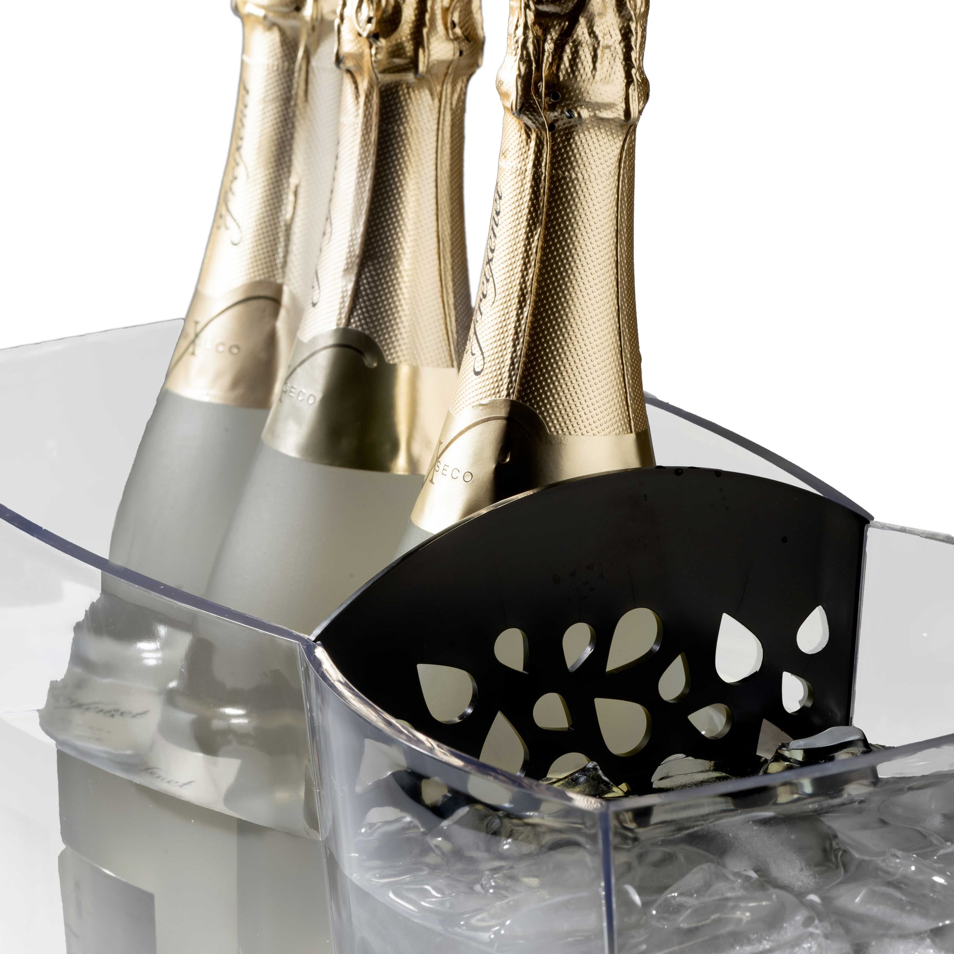 I fori del separatore, a forma di gocce d'acqua, permetteranno all'acqua contenuta nel secchiello del ghiaccio di raffreddarsi, mantenendo le bottiglie alla temperatura ideale. Uno dei vantaggi di questo secchiello per il ghiaccio è che poiché i cubetti di ghiaccio sono separati, l'area in cui si trovano le bottiglie non sarà coperta da essi, il che creerà una meravigliosa vetrina per il consumatore per vedere le etichette delle bottiglie, con un effetto lente d'ingrandimento e leggermente inclinato come in un espositore grazie alla forma della base della vaschetta del ghiaccio.